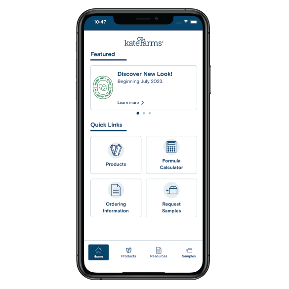 Use the Kate Farms app to quickly access formula specifications, storage and use guidelines, ordering information, and more.